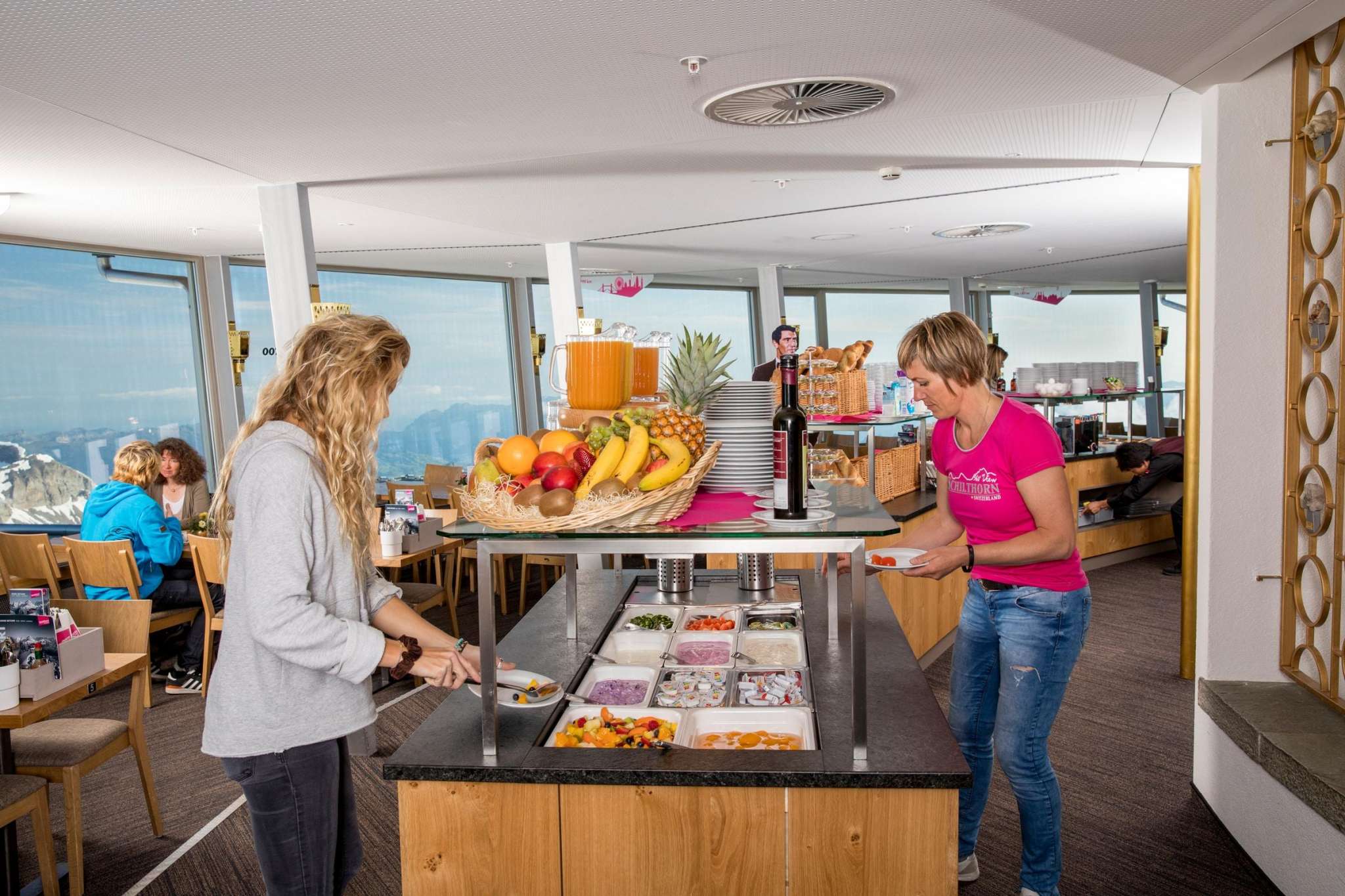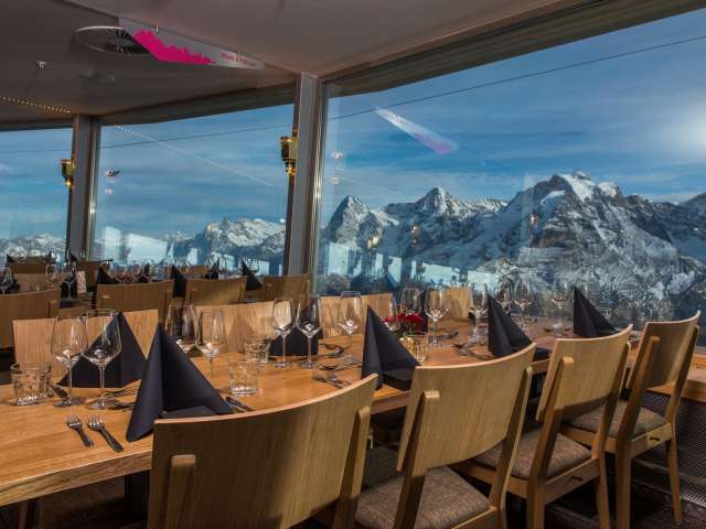 In 45 Minuten dreht sich das höchstgelegene Restaurant der Region Mürren einmal um die eigene Achse. Und so gleiten während dem täglich angebotenen Brunch über 200 Berggipfel an dir vorbei.