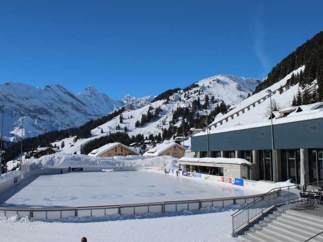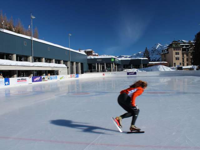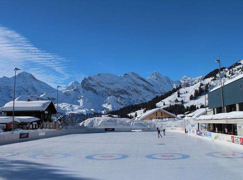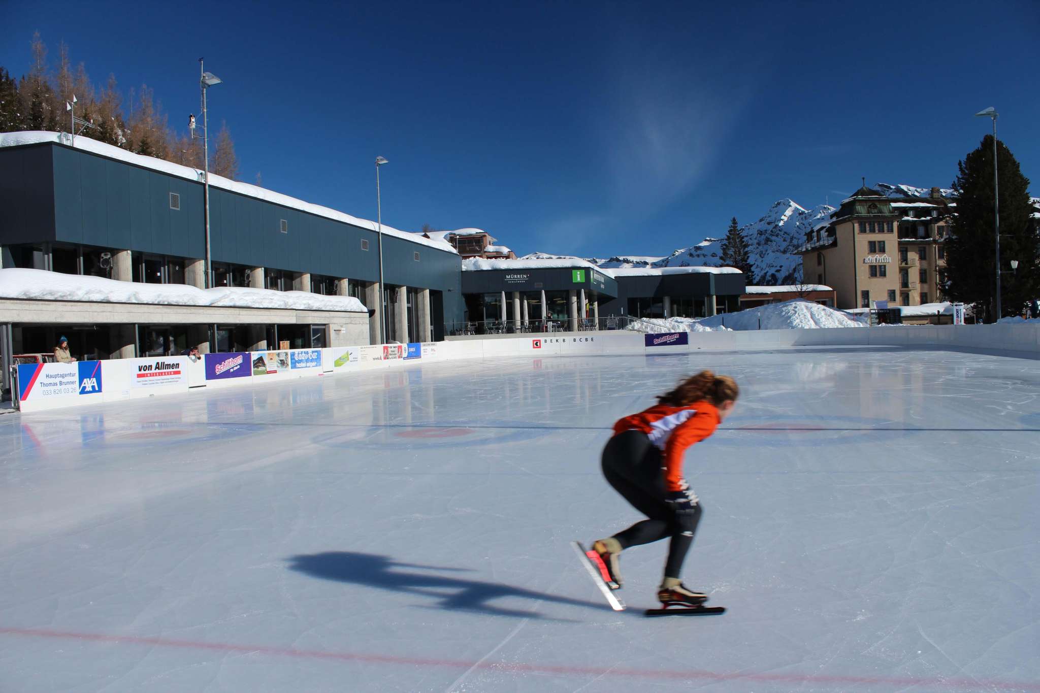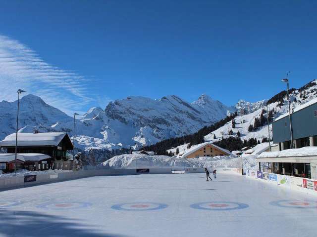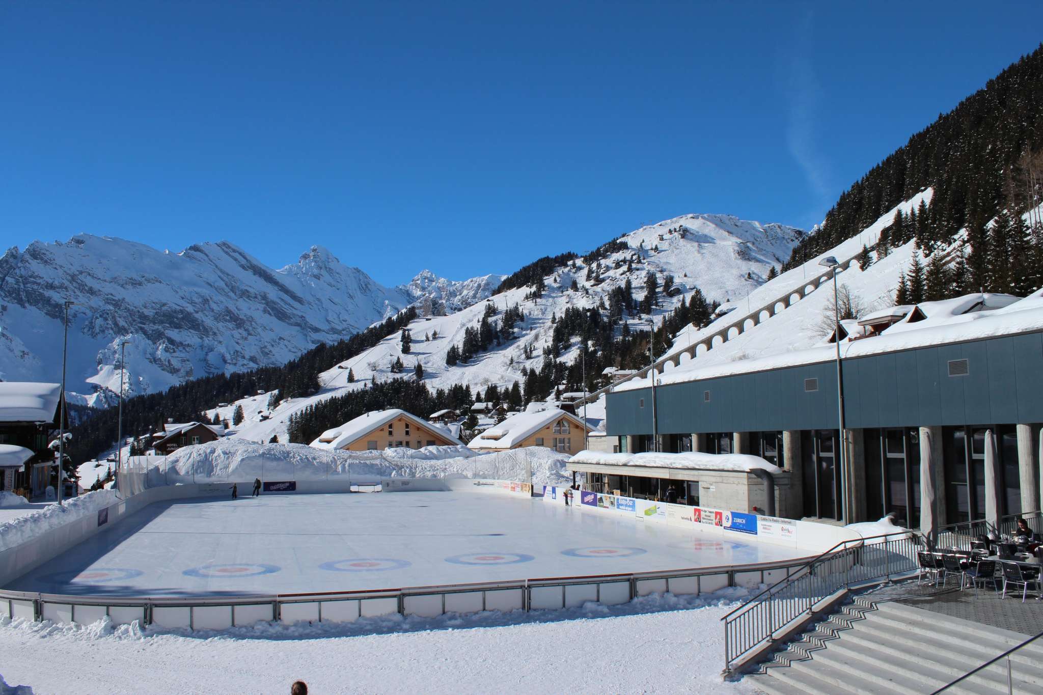 Die Kunsteisbahn unter freiem Himmel beeindruckt mit wunderschönem Bergpanorama im Hintergrund. Ob Schlittschuhlaufen, Eishockey, Curling oder Eisdisco, hier ist immer etwas los.