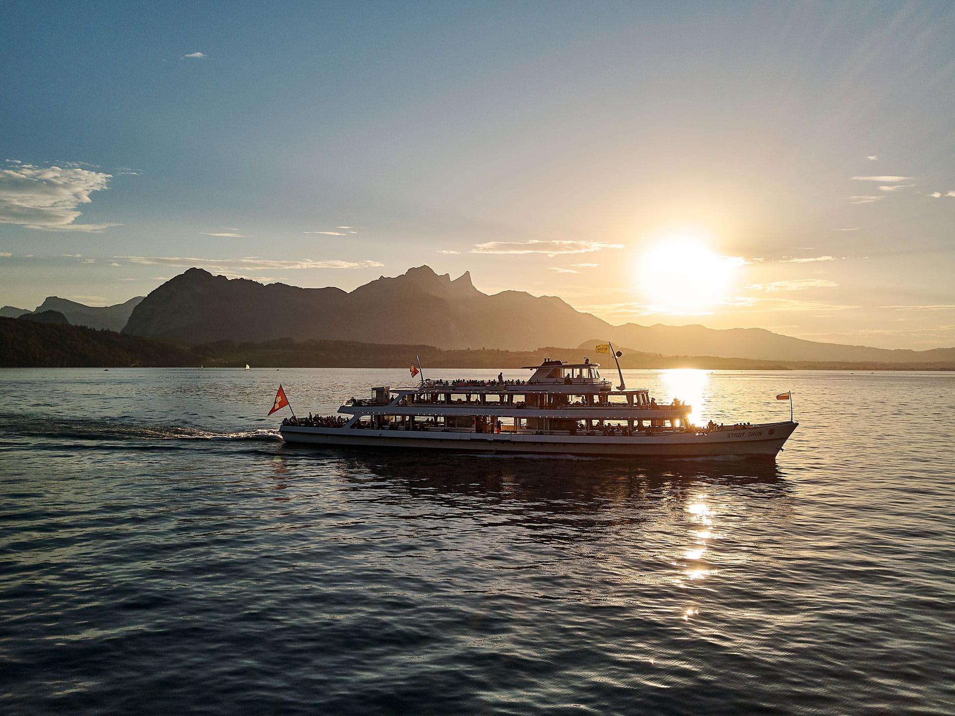 Die Schifffahrt hat eine lange Tradition: Bereits 1835 nahm das erste Dampfschiff den Betrieb auf dem Thunersee auf. Heute sorgt eine moderne Flotte für komfortable Fahrten – sei es als gemütliche Verbindung zwischen Ausflugszielen oder als stimmungsvolle Kulisse für kulinarische Themenfahrten.