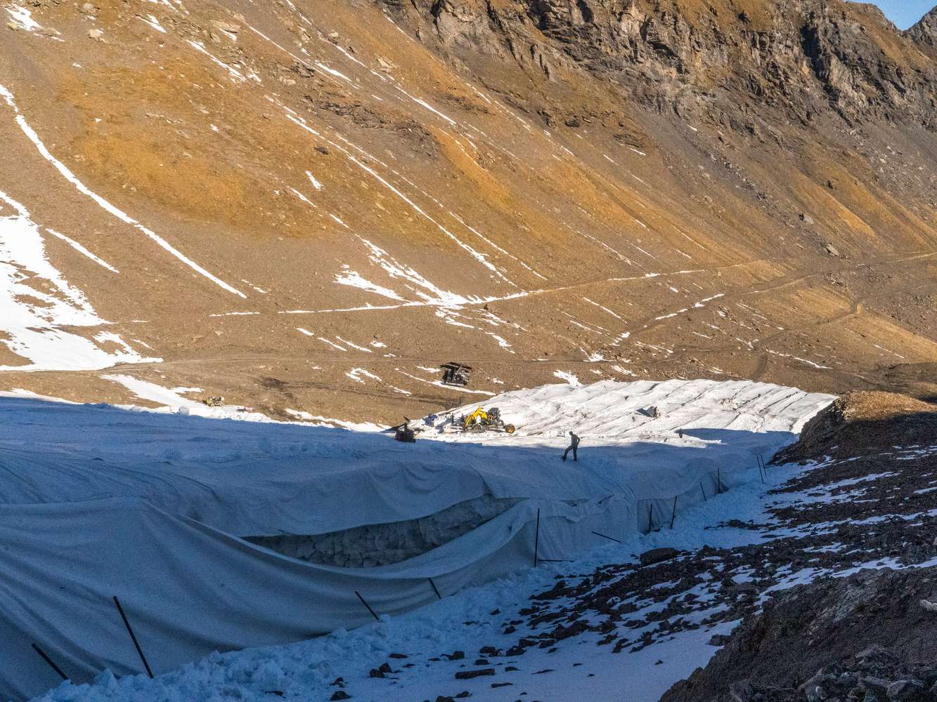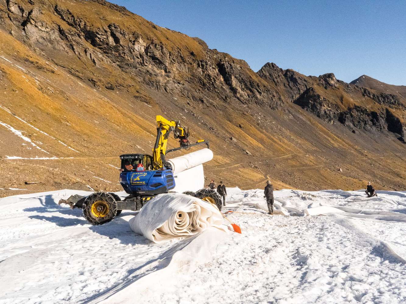 Nun also, rund vier Monate später, werden die Depots abgedeckt, der ganze Schnee darunter verstossen und zu einer Skipiste verarbeitet. «Trotz überdurchschnittlich heissem Sommer hat sich die Gesamtmenge nur um rund 15 Prozent verringert. Es ist also mehr als genug Schnee vorhanden, um bereits Anfang November in die Wintersaison zu starten», erklärt Bühler. Aber die Zeit drängt. «Mit vier bis sechs Mann sind wir nun seit drei Wochen an der Arbeit, in einem Monat müssen wir mit der Piste fertig sein», sagt er – verabschiedet sich und geht zurück auf die «Baustelle».