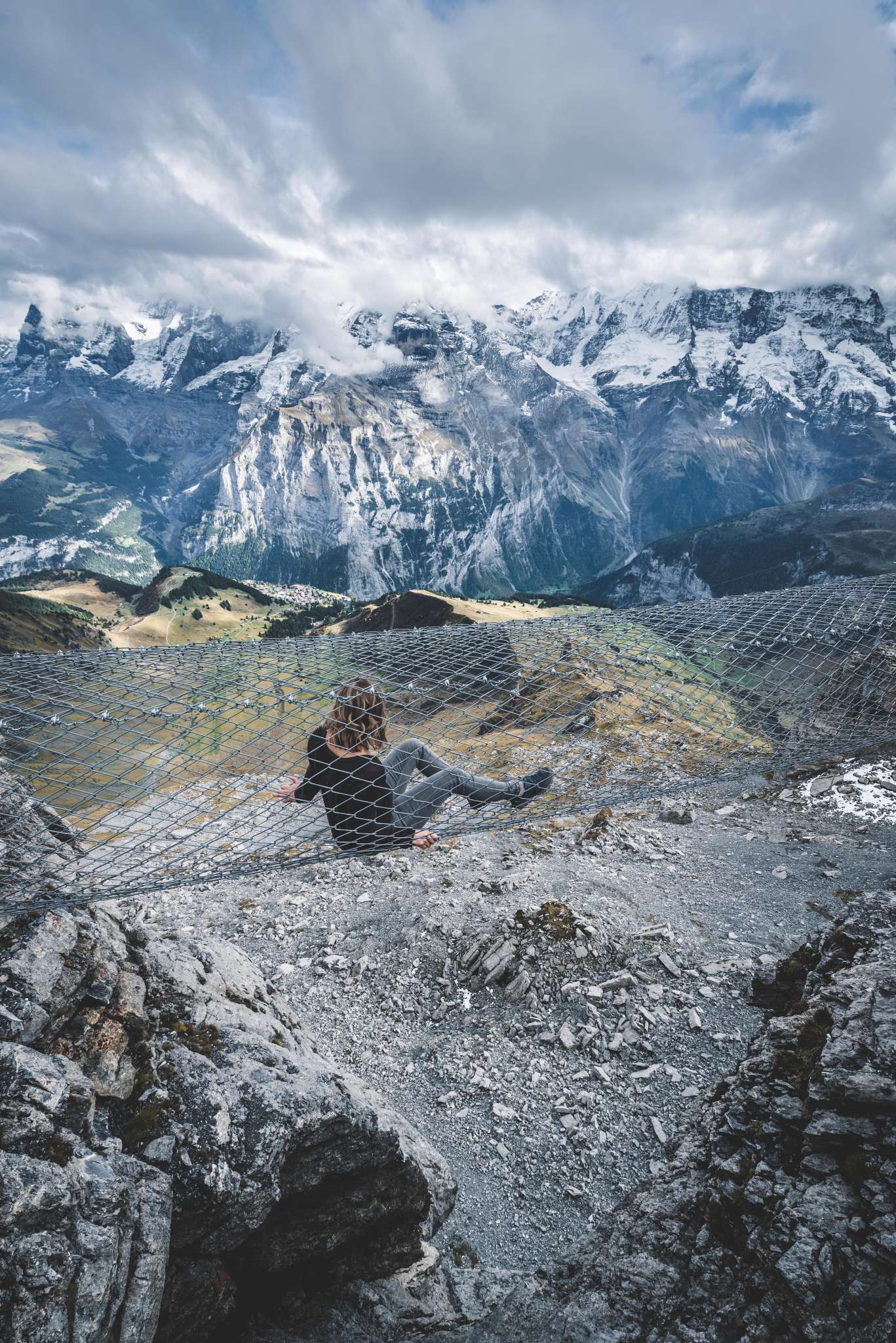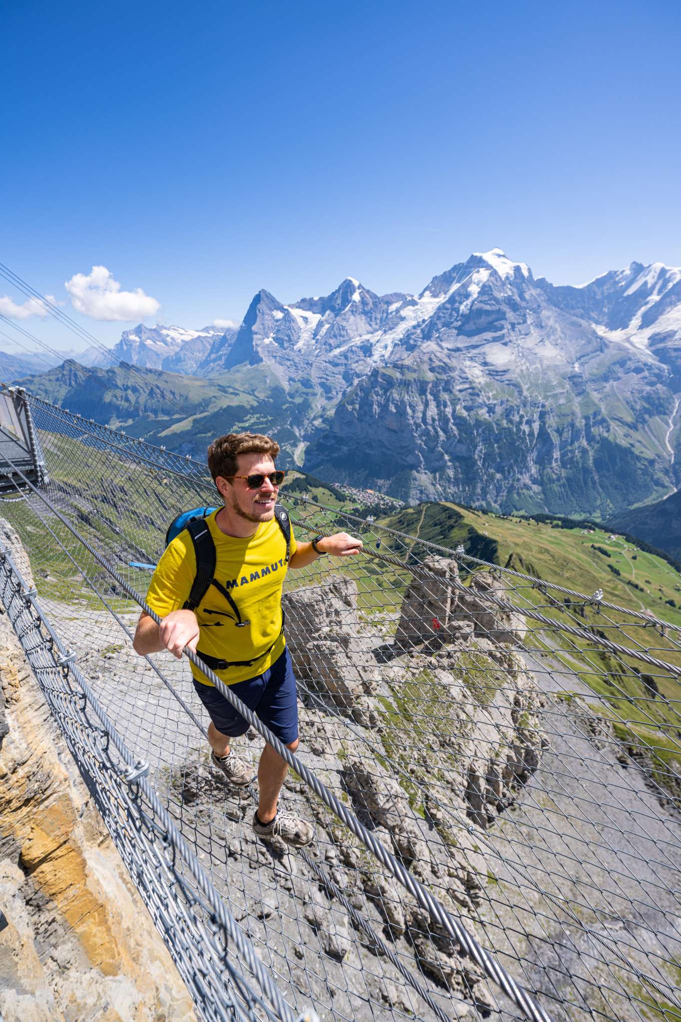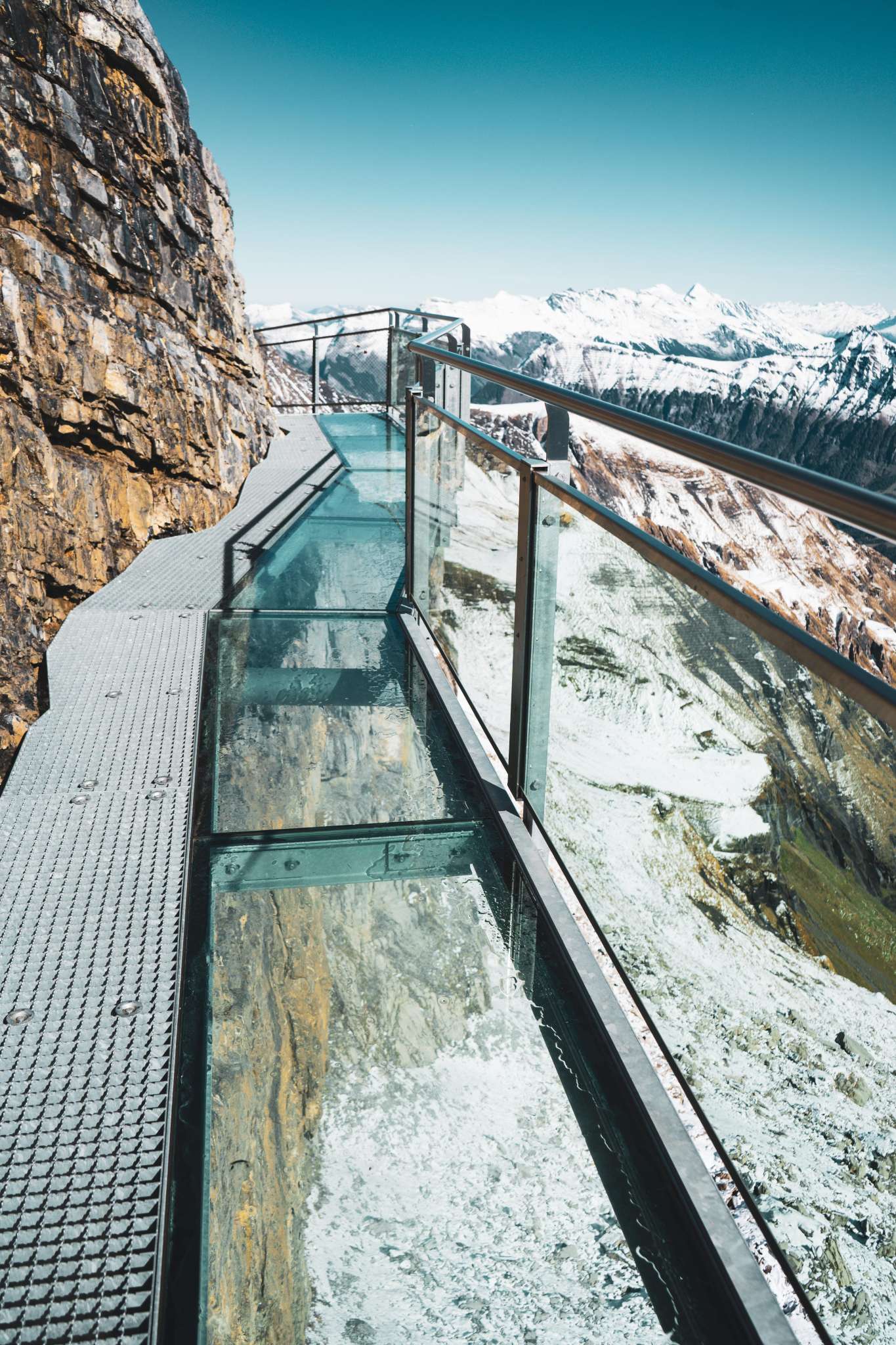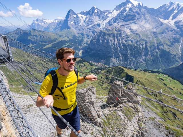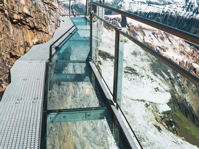 If you make your way from Mürren towards the Schilthorn, you will arrive at the Birg middle station after the first gondola ride. You should plan a longer stop here to visit the Thrill Walk. It guarantees a higher pulse rate for all those who dare to cross it. The approximately 200 metre long rock walkway was built into the rock along the vertical abyss. The construction made of steel and glass as well as a floor made of gratings blends seamlessly into the angular rocky landscape. You should spend around 45 minutes visiting the Thrill Walk so that you have enough time to take some spectacular photos. In addition to the grating that makes up most of the walkway and stairs, there are around 20 metres of glass floor, cattle grid floor elements and a nine-metre-long rope bridge complete with safety net. An eight metre long crawl tunnel completes the experience. The entrance to the Thrill Walk is located on the side of the panoramic terrace at Birg station. After 200 metres of thrills, you will reach the end of the walkway further down. From there, a gravel path (snow-covered in winter) leads up to the station building.