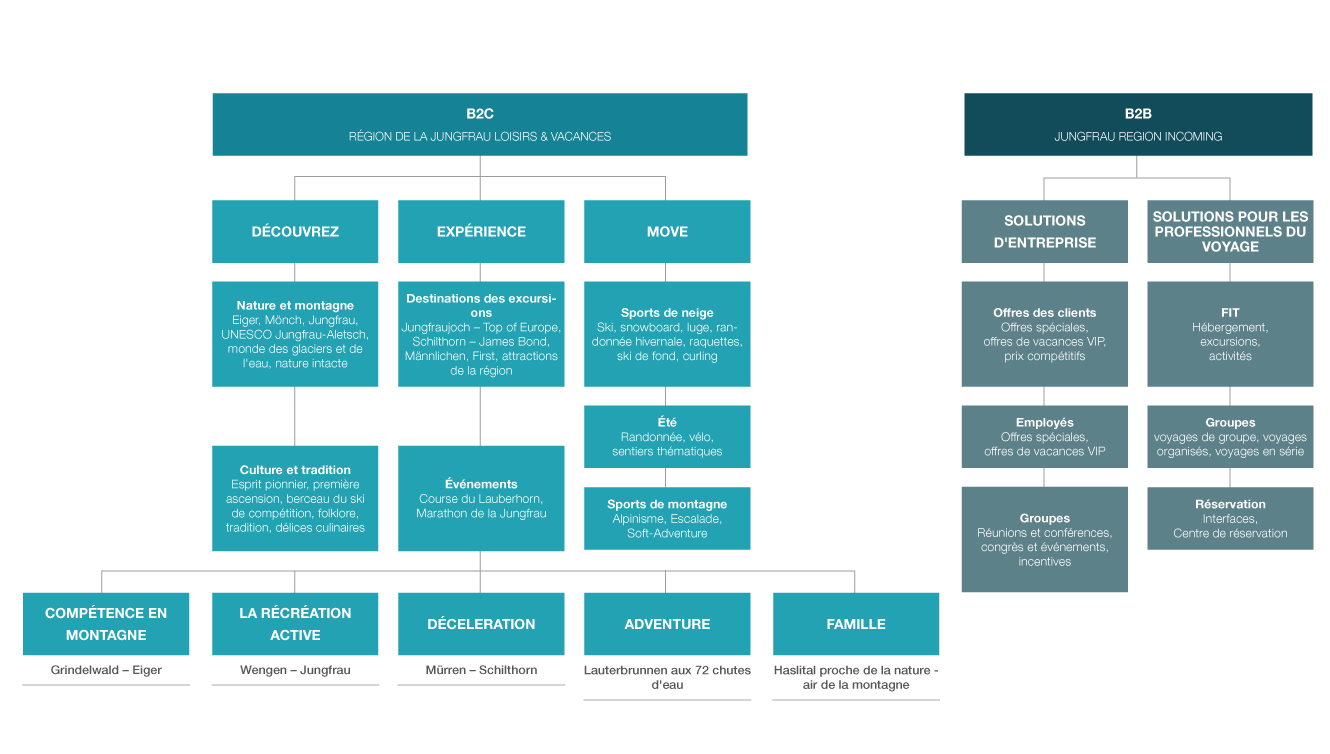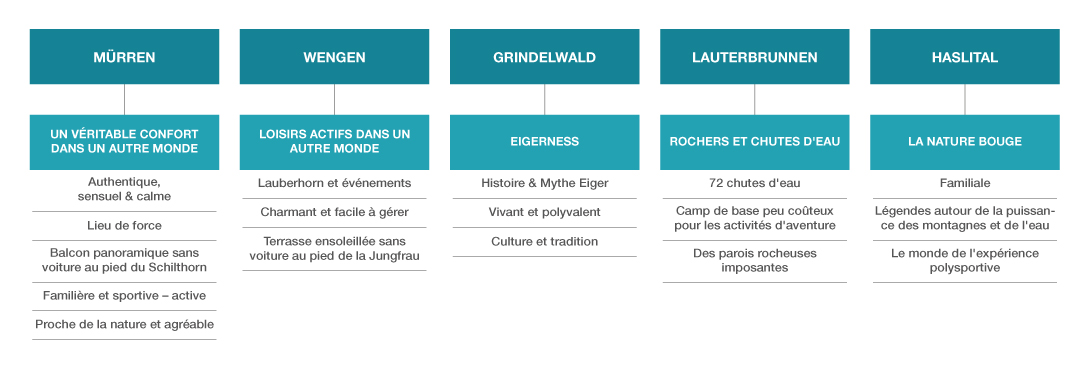 Conformément à notre stratégie multi-marques, chaque marque, à l’instar de la société Région de la Jungfrau Tourisme AG, dispose de son propre positionnement visant à mettre en avant ses caractéristiques et valeurs propres.