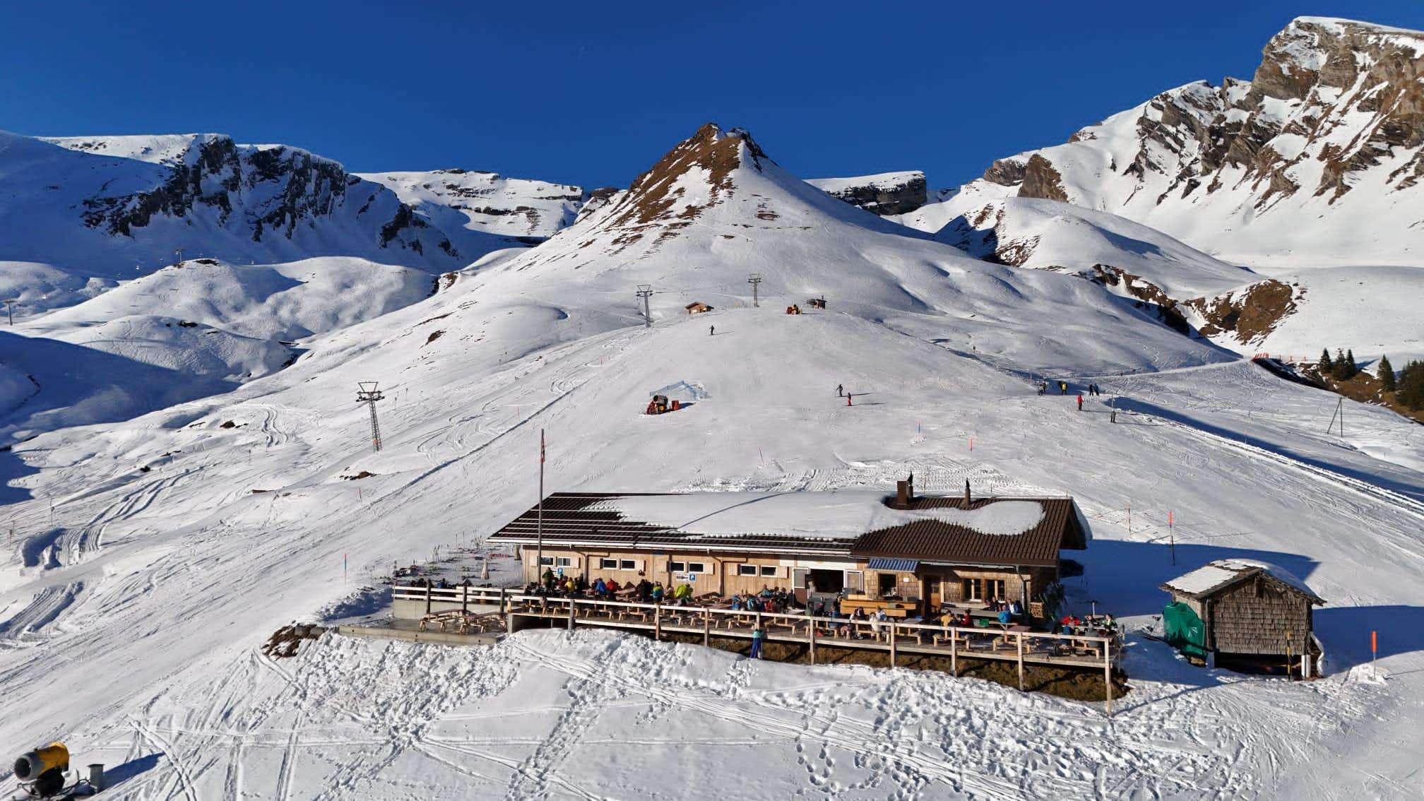 Profitez de la vue panoramique à couper le souffle depuis la terrasse de la cabane sur la piste n° 13 dans le domaine skiable de First.