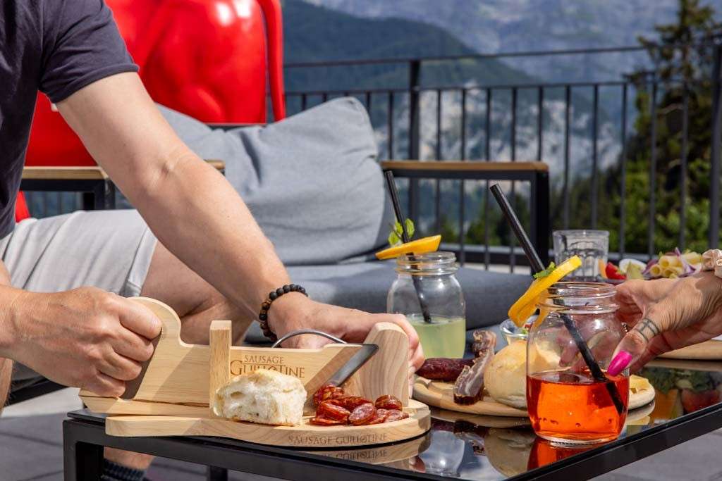Qu'il s'agisse d'une excursion de randonnée détendue ou d'une descente de montagne variée en VTT : une petite pause fait toujours du bien. Directement sur le toit de la station de téléphérique de Grütschalp, le charmant bistrot invite à la détente. Il sert de point de départ pour des randonnées panoramiques et un trail freeride pour les vététistes* expérimentés. Toute l'année, tu seras choyé ici avec une offre petite mais bien pensée de snacks et de boissons - ainsi qu'une vue à couper le souffle sur les trois sommets Eiger, Mönch et Jungfrau. Ici, on aime rester assis un peu plus longtemps.