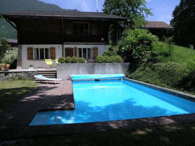 En été: Grand jardin privé avec espace détente, piscine extérieure à usage exclusif (8,5 x 4 m, en service du 7.6 au 13.9, chauffée à 21–23°C, couverture de sécurité pour enfants, système de filtration au sable, serviettes de bain fournies), pelouse, pavillon de jardin, mobilier de jardin, arbres anciens, fontaine en bois avec eau potable, grand coin repas extérieur avec table et banquette d’angle en bois.