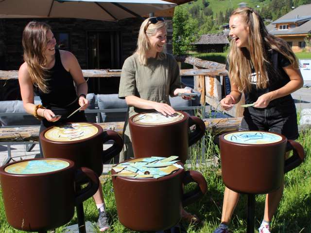 Découvrez le village en vous amusant ! Testez votre habileté dans le labyrinthe de la fondue au fromage, résolvez le puzzle de la mousse de café, maîtrisez le circuit de l’Eiger, jouez au hockey des bouquetins, remportez la partie de cartes du Schilthorn, marquez des buts au baby-foot XXL ou prouvez votre talent au curling. De nombreux jeux phares vous attendent ! Les postes de jeu sont conçus individuellement et s’adaptent thématiquement à leur emplacement. Vous avez le choix entre 16 postes : sur des tables, au sol, sur les murs, devant des bâtiments, le long des points de vue, dans les magasins, les cafés et les restaurants. L'offre est très variée et comprend des jeux de cartes, de dés, de pose, de logique, d'action, d'adresse et des jeux en grand format. Les jeux peuvent être joués dans n'importe quel ordre et en nombre illimité. L'emplacement des postes est indiqué sur le plan figurant dans le livret des règles du jeu. Un sac à dos de jeux est nécessaire pour un groupe ou une famille (4 personnes). Le sac à dos de jeux peut être utilisé toute la journée pour le Ludotrail. Lors de la remise du matériel, une caution (pièce d'identité officielle : carte d'identité ou permis de conduire) doit être déposée. Une fois les jeux terminés, le sac à dos contenant le matériel doit être restitué au point de distribution (veuillez respecter les horaires d'ouverture). Tout matériel manquant sera facturé. L'utilisation du Ludotrail «Spiel dich durch Mürren» se fait sous votre propre responsabilité. Ludotrail, Mürren Tourismus, la commune de Lauterbrunnen et les parrains du jeu déclinent toute responsabilité.