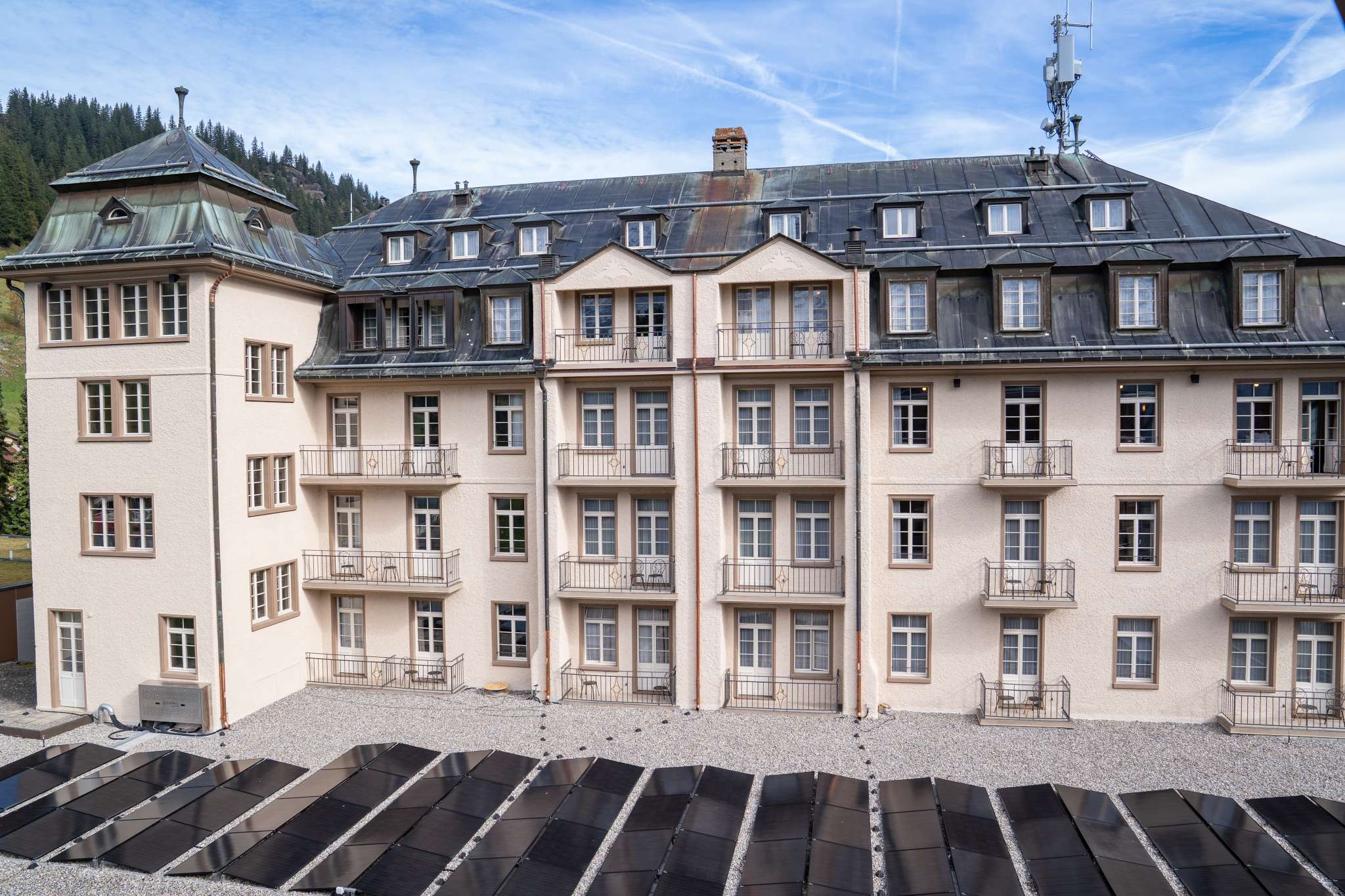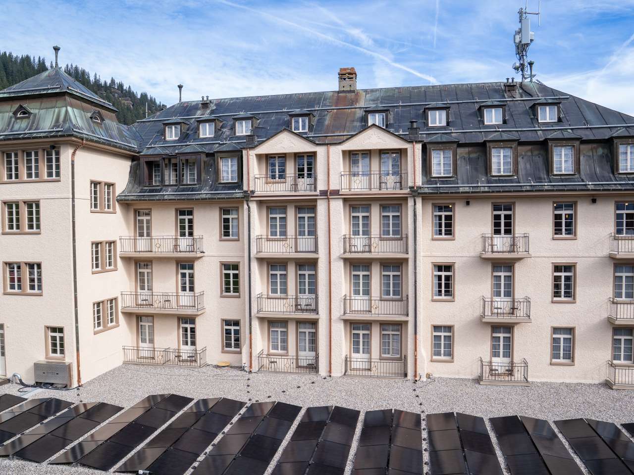 Le Palace Hotel a 120 lits, répartis dans 33 chambres d'hôtel et 3 appartements en duplex dans le bâtiment principal, ainsi que 14 suites dans le nouveau bâtiment elliptique relié par un passage souterrain. Là aussi, l'équipe d'Emanuelle est déjà en train de nettoyer. Je me surprends à imaginer que je bois du champagne dans la piscine de la loggia tout en profitant de la vue incroyable sur l'Eiger, le Mönch et la Jungfrau. L'espace spa me plaît aussi beaucoup. Mais je me ramène vite à la réalité: après tout, je suis ici pour écrire un article.