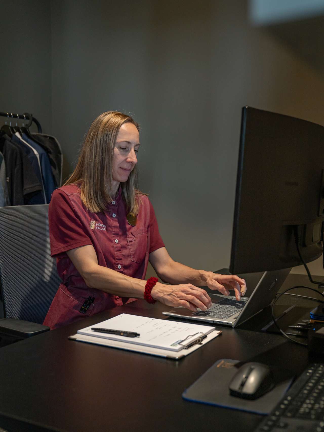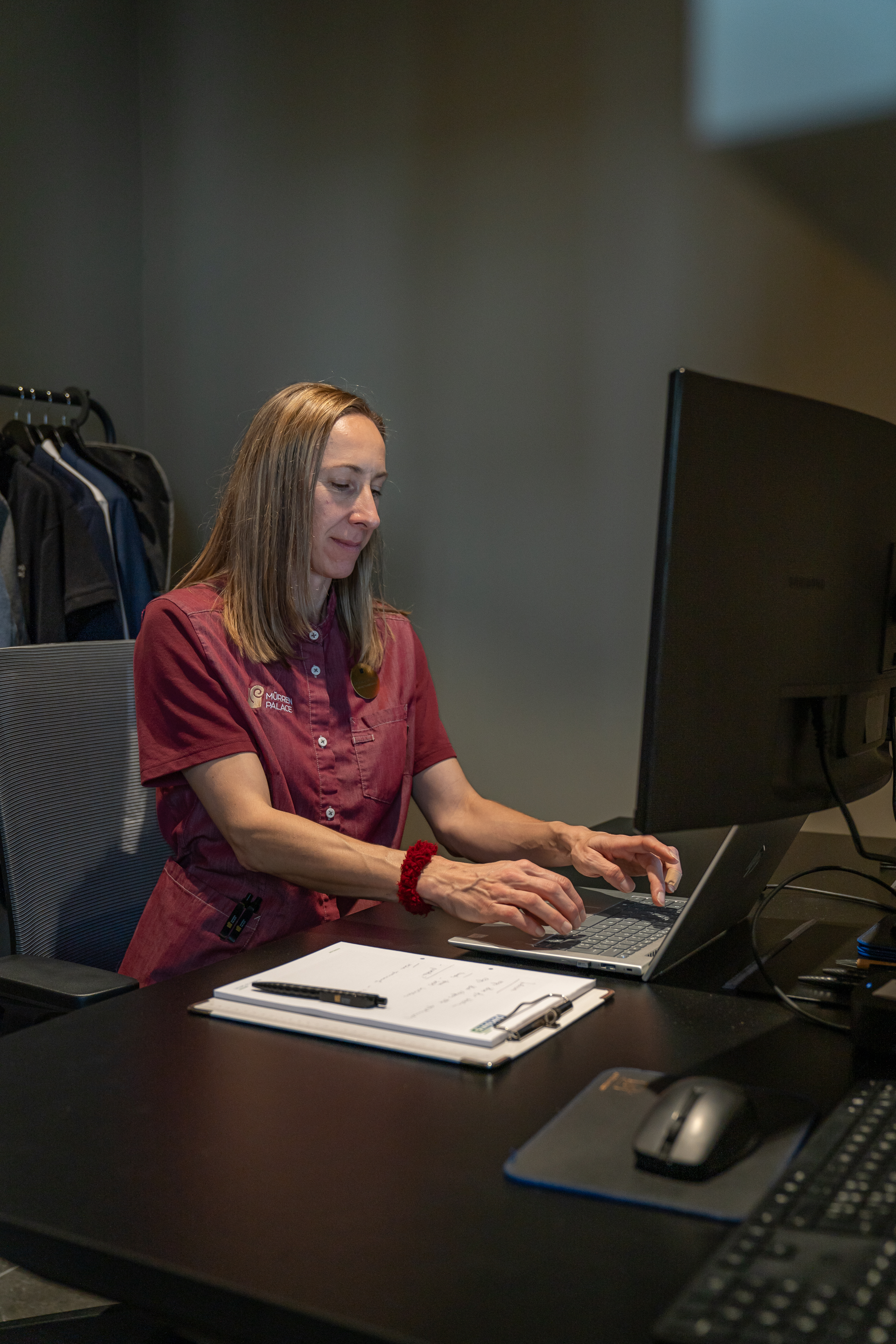 Originaire de Croatie, elle s'est maintenant installée à Gimmelwald et commence sa journée de travail à 7h30. À la réception, elle jette un œil au planning de la journée. Elle s'intéresse aux arrivées tôt le matin ou aux départs tardifs, ainsi qu'aux demandes spéciales des clients, qu'il s'agisse d'un lit bébé, d'un oreiller spécial ou d'une gamelle pour chien. Quelques minutes plus tard, elle discute du programme de la journée avec son équipe, composée de dix collaboratrices.