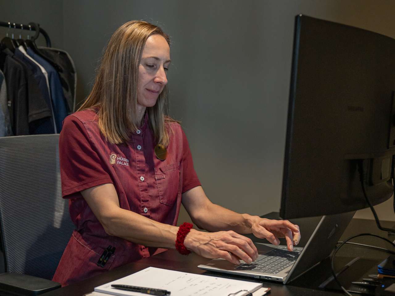 On suit Emanuelle partout, et elle bouge beaucoup. À midi, mon appli sur mon téléphone montre déjà 10 000 pas. Cette femme de 42 ans est toujours en mouvement, sauf pendant les quelques minutes par jour qu'elle passe devant son ordi pour faire des tâches administratives. Ça comprend, par exemple, la création des plannings de service.
