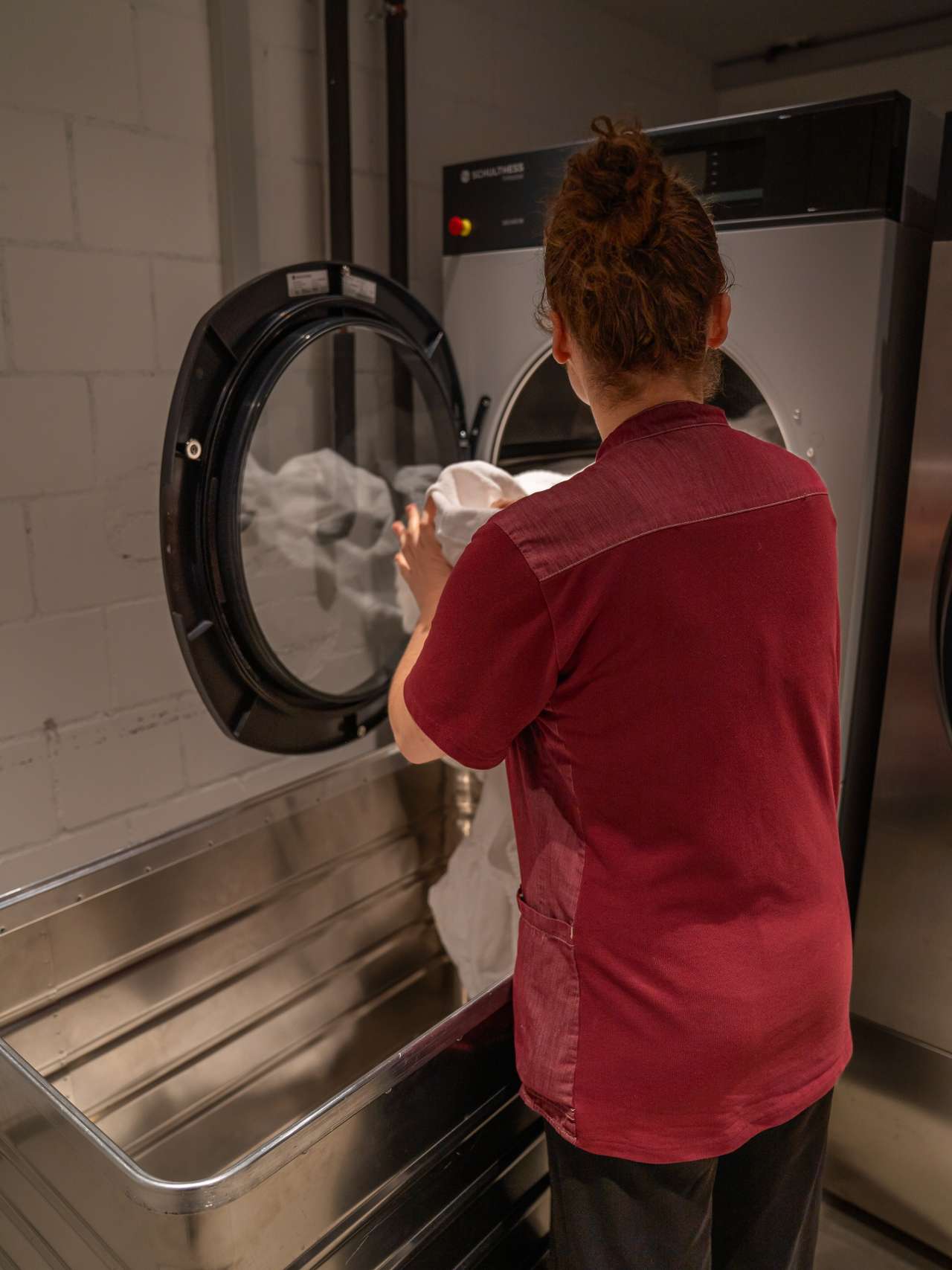 On passe à la blanchisserie. Deux machines remplies de serviettes en éponge tournent. Le linge de lit, en revanche, est lavé à l'extérieur, à Interlaken.